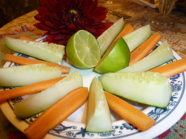 Chop carrots and cucumbers. Sprinkle lemon juice to taste. Don’t eat the dahlia.