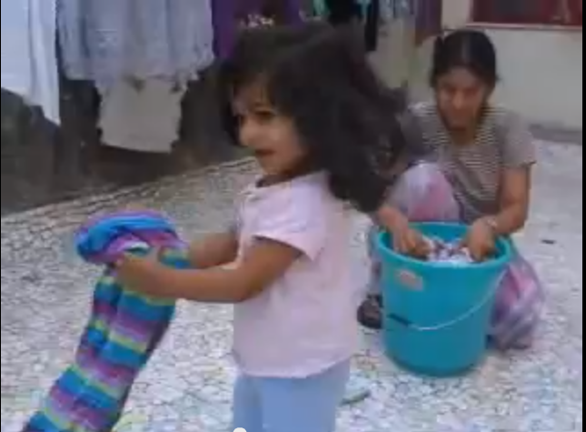Laundry:  Laundry is great for kids, especially kids laundry which fits nicely into their little hands.  Let them wash, dry and fold.    If you have a machine, let them help load and unload.  If you don’t have a machine, then the fun really begins.  Let them swish the clothes around in the bucket, scrub them with a brush, squeeze out the water and hang them up to dry.  This was one of our favorite was to stay cool during hot afternoons.  Here is my one-year-old drying the clothes after one such washing session.