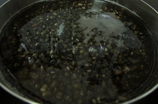 Urad (black gram) has soaked for six hours. Small bubbles have formed.