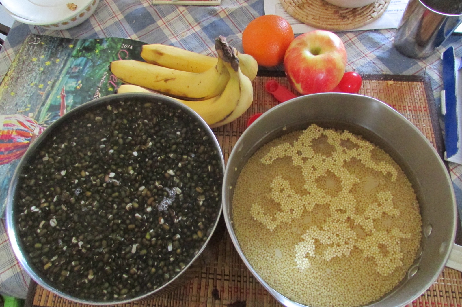 The ratio I generally use is: 1 part brown rice, 1 part millet, and 1 part whole urad (or split urad provided it is with peel). Urad dal is called black gram in English but there is literally never any need to use the term “black gram” because no one who uses urad dal calls it by an English name. It is called minapappu in Telugu but there is no store that sells minapappu that would not understand the term urad dal. SO this is an item for which the English name is relevant ONLY for ONE purpose and this is to remind you that black gram is BLACK. Do not buy black gram that is white. You may find the notion of white black gram absurd and yet there in the store you will see bags ranging from 800 grams to 4 kilograms containing a white substance and yet labelled “black gram” or “urad dal.”