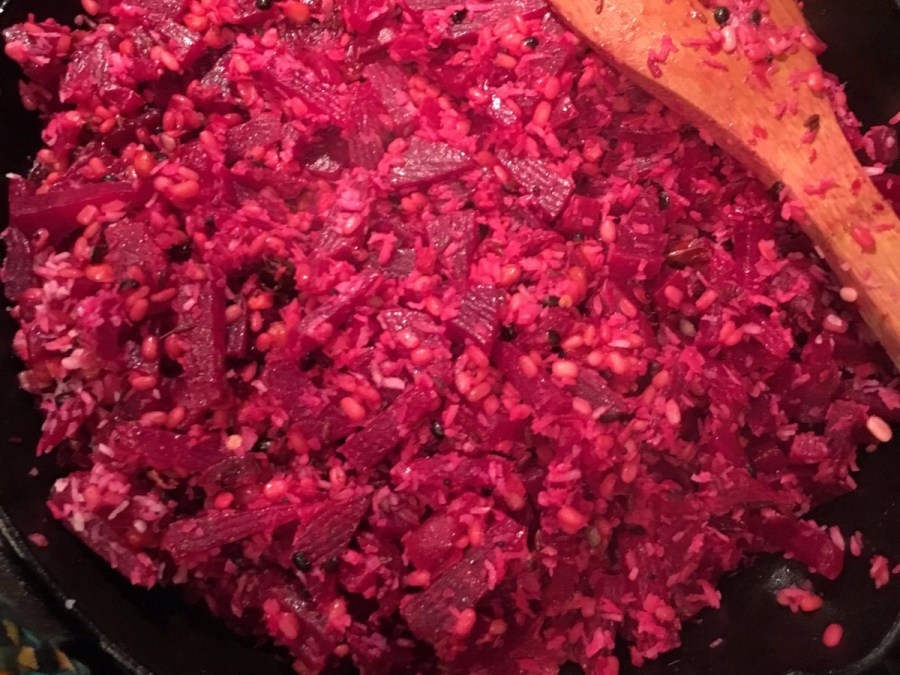 Hearty spiced beets with mung dal and coconut.