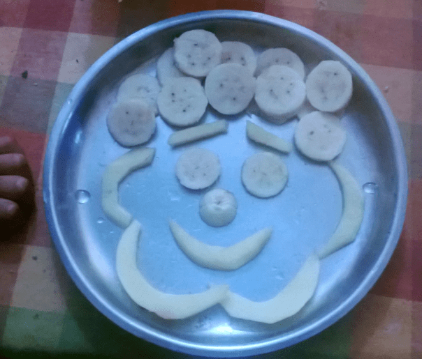 Slice banana and cut apple into thin sections. Arrange in a happy face! Chetana K, Bangalore.
