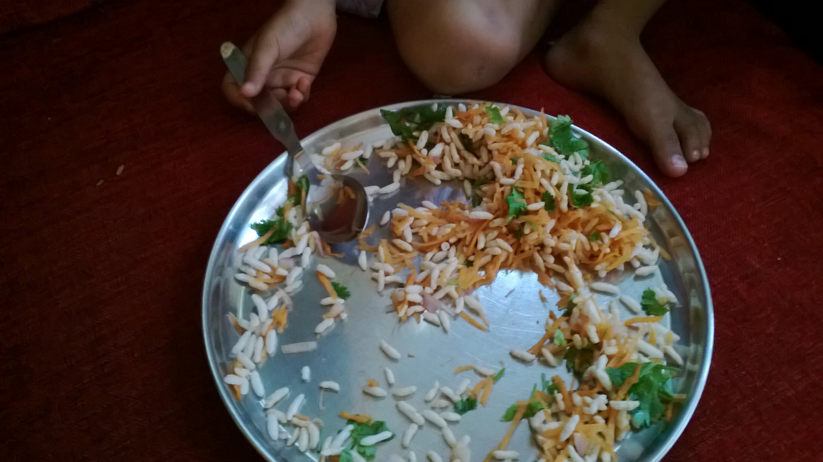 Mix up grated carrots, chopped onions, corriander, roasted peanuts, lot of lime juice with puffed rice. Chetana K, Bangalore.