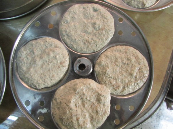 Aerial view of idli plates with sama idli (little millet idli) batter.