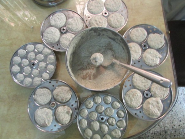 I added an equal amount of minapappu aka urad dal or black gram and soaked it overnight. I forgot until the next evening but the upside of this sudden fall weather is that it is cold enough that the extra long soak was ok. I ground in the evening. The next morning it had risen impressively in spite of the cold weather. Wow!
